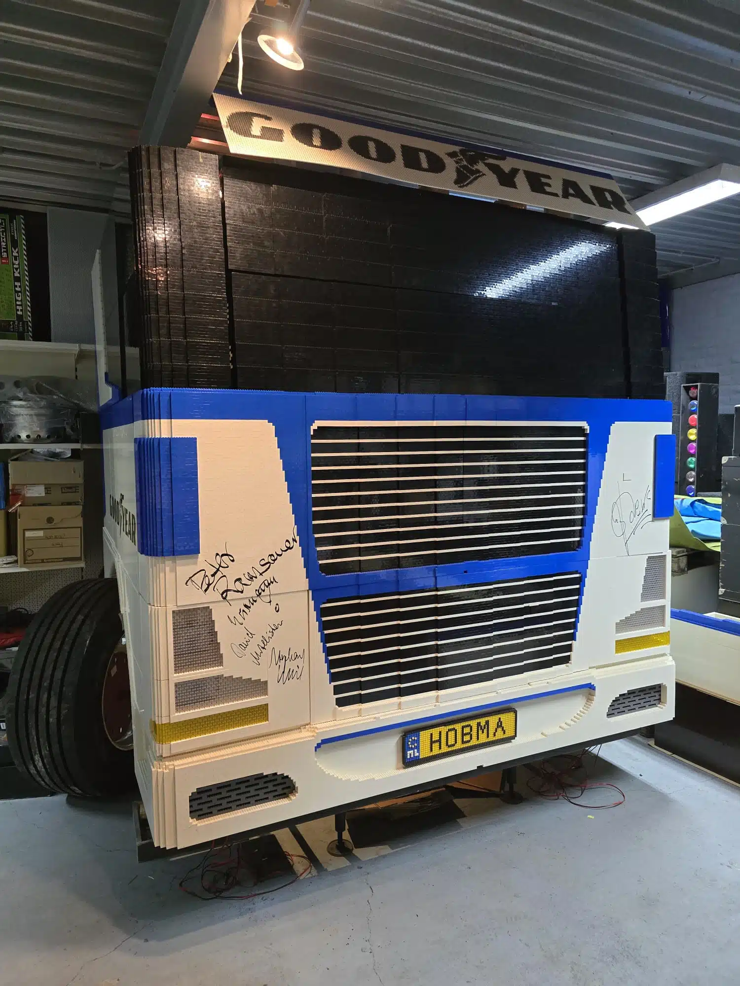 De LEGO-vrachtwagen van Goodyear op schaal