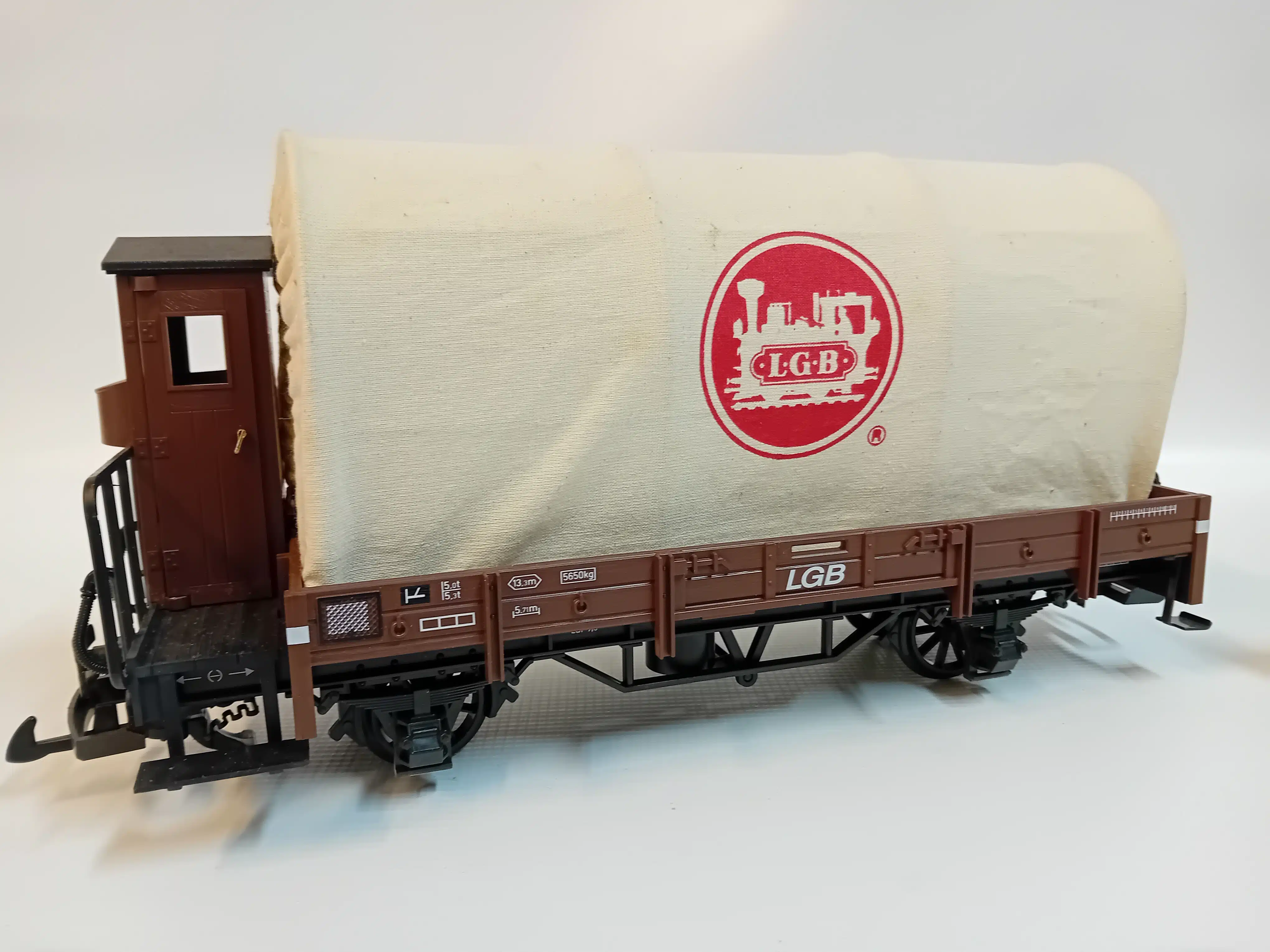 LGB 40130 Lage goederenwagen met platform en remcabine. Laadzeil van canvas, gespannen met 4 bogen