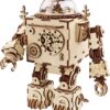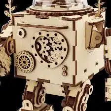 Onze Orpheus is een miniatuur bouwpakket van een statische robot in onvervalste steampunkstijl. Statisch in de zin van dat hij niet kan lopen, maar hij maakt wel muziek en in zijn ‘glazen’ koepel draait een propeller mee als je hem opwindt. Daarnaast geeft hij licht! Dit tezamen met het lieflijke melodietje maakt hem een perfect lampje op een nachtkastje van bijvoorbeeld een kind. De armen en benen kunnen trouwens wel bewogen worden. Daardoor kun je kiezen of je hem wilt laten zitten of wilt laten staan. Lees snel verder over knutselen met hout!
