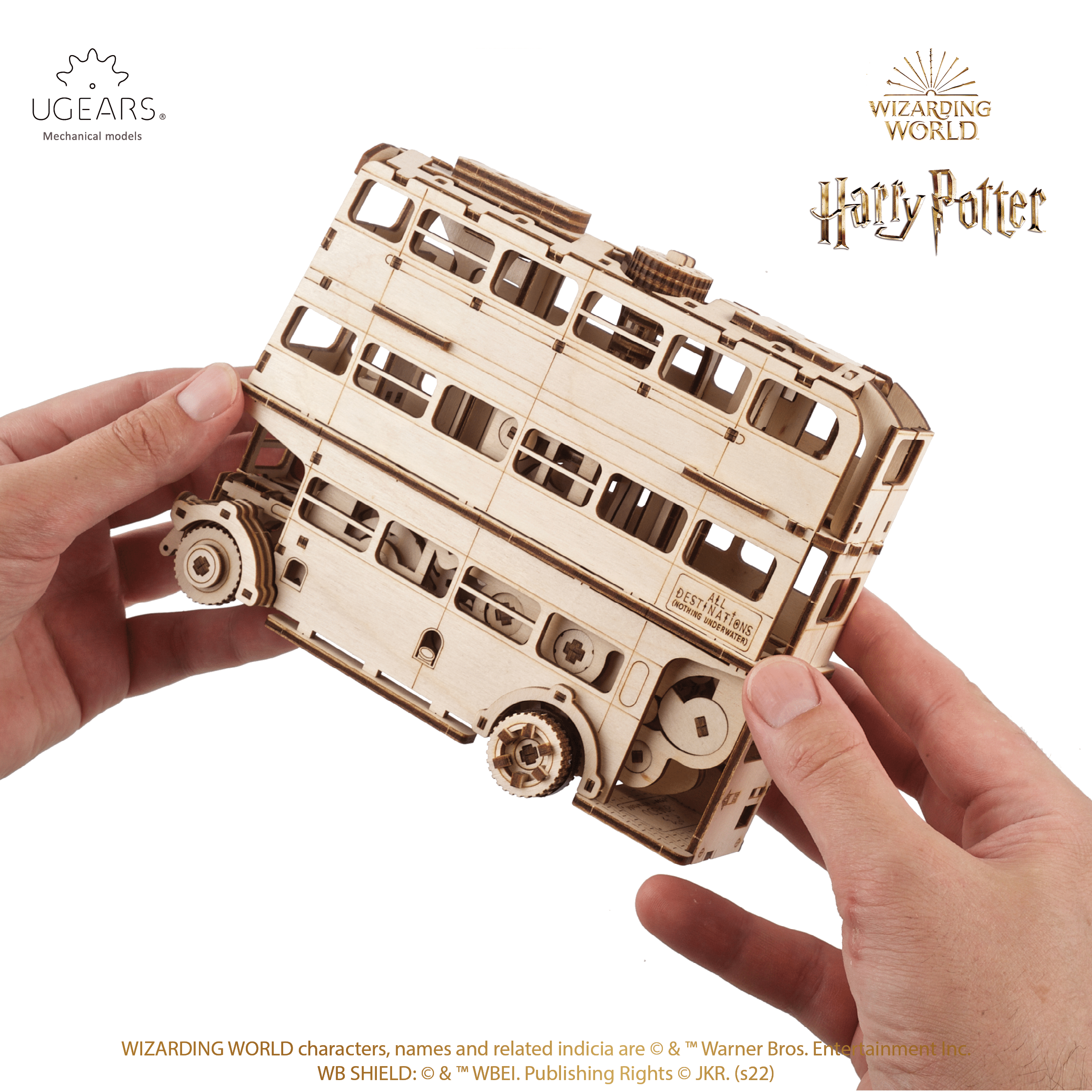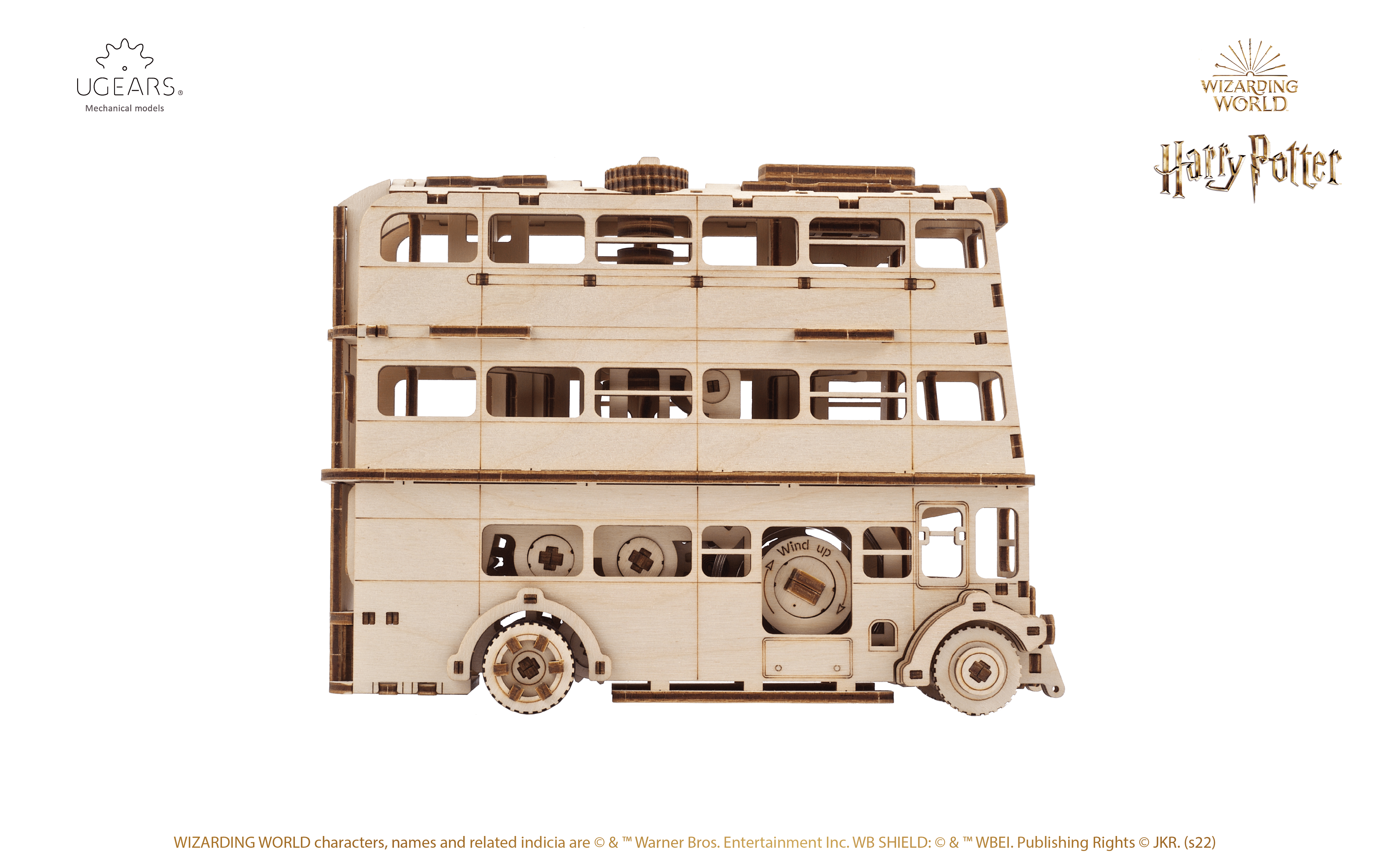 De Knight Bus TM uit de Harry Potter-serie is hier om jonge tovenaars te redden en alle Potterheads- en Ugears-fans over de hele wereld te verrassen. Deze doe-het-zelf houten mechanische modelbus is een spannende toevoeging aan de Ugears Harry Potter-collectie en inderdaad een heel knap staaltje techniek. Om deze driedubbele bus te maken, met zijn unieke kenmerken uit het tovenaarsuniversum, hebben onze Ugears-ontwerpers en -ingenieurs zichzelf een ambitieus doel gesteld: een bus maken die zichzelf kan verkleinen, uitbreiden, en van snelheid veranderen, net als in de film ‘Harry Potter en de gevangene van Azkaban’. De snelle Knight Bus TM kan brult door de straten van Dreuzel Londen (of je woonkamer) dankzij de krachtige veeraangedreven motor die wordt opgewonden met een geheime sleutel die bovenop de bus is opgeslagen. Trek de magische manipulatorknop omhoog, ook op het dak van de bus, om de aandrijftandwielen te vergrendelen en te voorkomen dat de bus wegrijdt voordat alle tovenaars en heksen aan boord zijn. Als de bus stilstaat, kun je nu de geheime opwindsleutel verwijderen, steek deze in het ratelmechanisme aan de zijkant van de bus en geef er een paar draaien aan. Om de bus in beweging te zetten, druk je op de magische manipulatorknop terwijl je de bus vasthoudt en dan laat je hem los! Het opvallende kenmerk van dit doe-het-zelf houten model is het vermogen om te transformeren door de breedte te verkleinen of uit te vergroten met een draai aan de magische manipulator. Draai de knop bovenop de bus tegen de klok in dan wordt de bus smaller, om tussen het verkeer door te knijpen. Draai de knop met de klok mee om de bus uit te breiden tot de ware grootte. Maar hier is het verbazingwekkende: als de breedte van de bus verandert, verandert ook de snelheid! In zijn normale (niet gecomprimeerde) toestand reist de bus verbazingwekkend snel. Comprimeer de bus en een intern mechanisme laat de bus in slow motion reizen.
