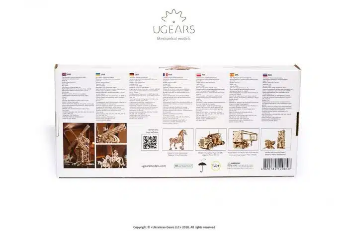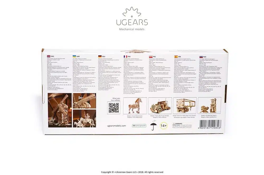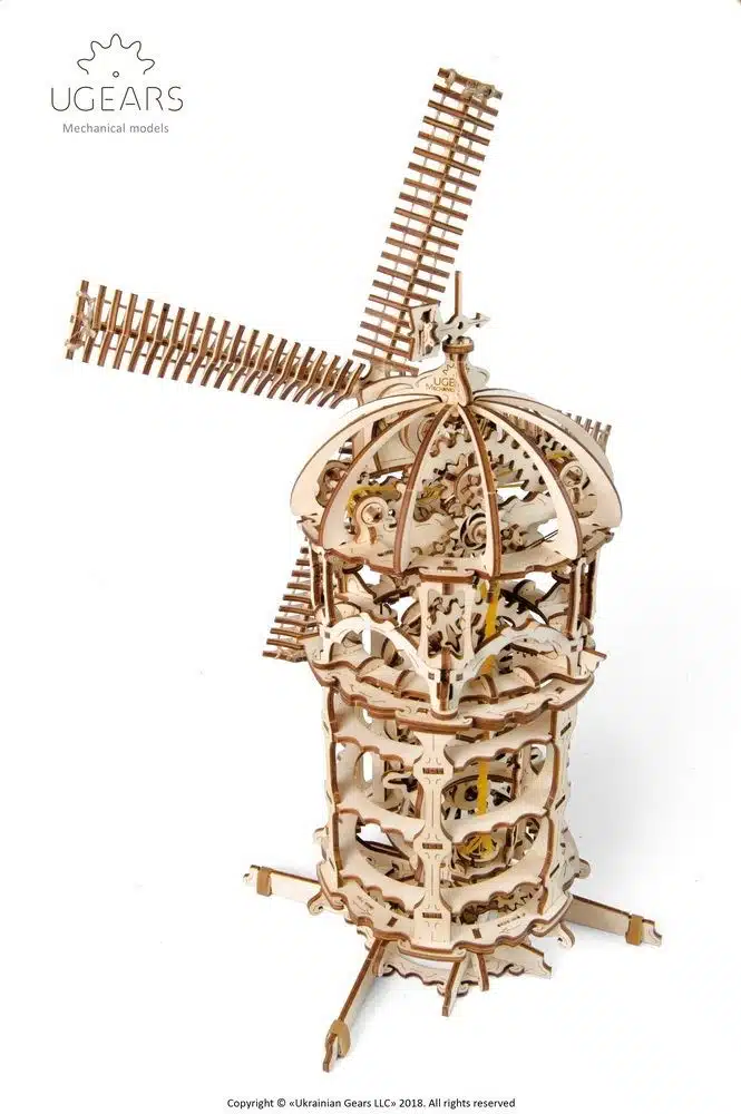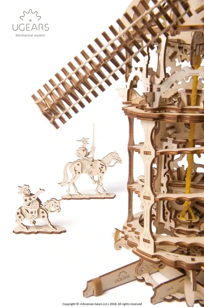 Deze prachtige molen wordt natuurlijk door Don Quichot samen met zijn trouwe knecht Sancho Panza zwaar bevochten. De Windmolen van UGears is meer dan een mechanisch puzzel. Het model is gebaseerd op de “Chesterton Windmill”, een 17e-eeuwse cilindervormige stenen torenmolen die buiten het dorp Chesterton, in Warwickshire stond. Gebouwd rond 1632-33, de Windmolen werd hersteld tussen 1965 en 1974 en vandaag is het de oudste torenmolen in Engeland die nog enkele originele werkende onderdelen bevat. “Het model wordt aangedreven door een verwijderbare rubber band-motor. Wanneer de motor is verwijderd, bedient u de windmolen “handmatig”, zodat u het fascinerende en complexe mechanisme tot in detail ziet werken.De rubber band-motor drijft de wieken aan met behulp van een schroeftransporteur (“worm feeder”) en een tandwiel versnelling. Het ontwerp van de tandwieloverbrenging heeft een “flexure link”, een type kettingaandrijving samengesteld uit veel kleine schakels. Deze kettingaandrijving van multiplex is nog nooit eerder in UGears-modellen toegepast.”